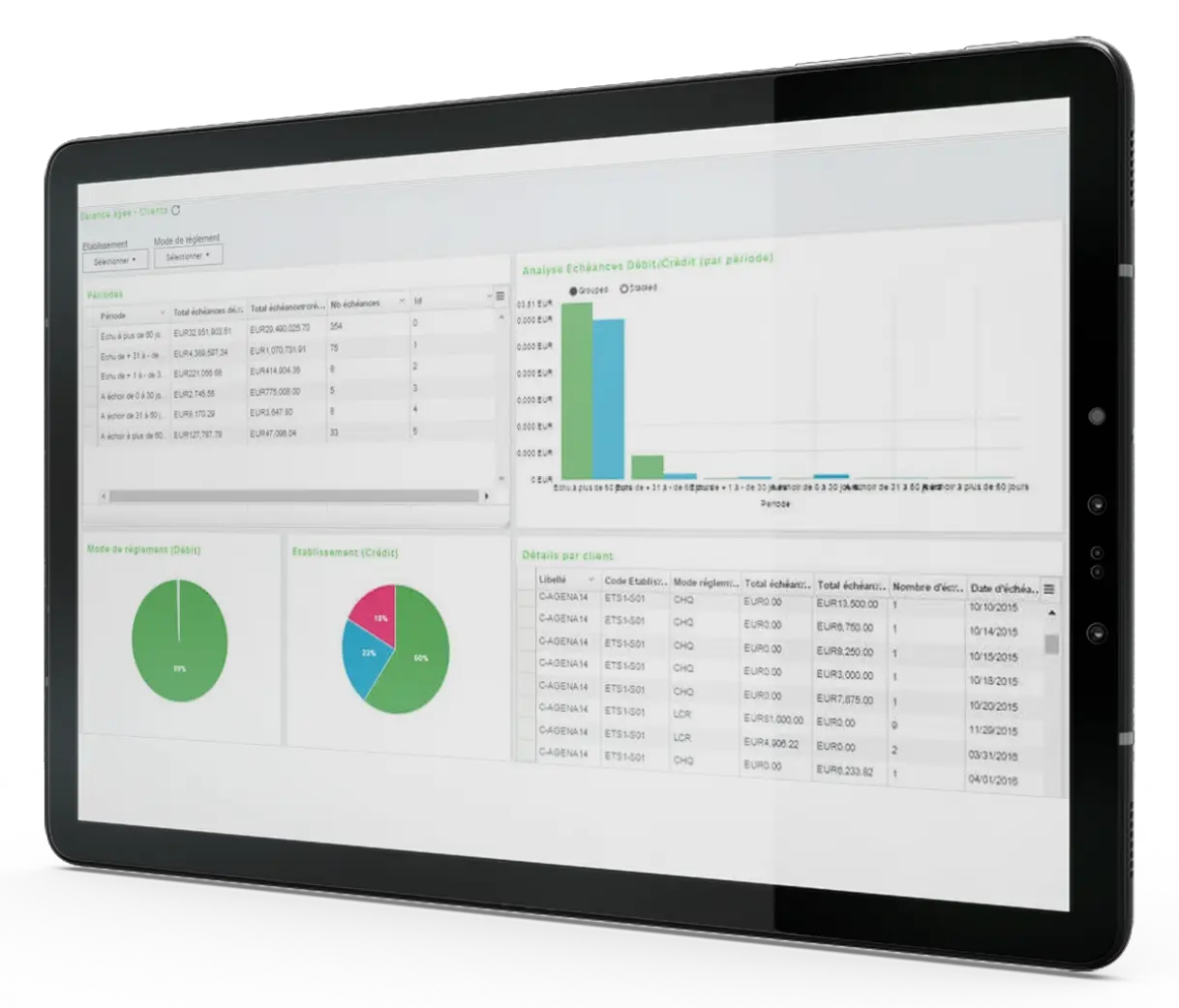 La gestion des moyens de paiement et du rapprochement bancaire sont intégrés en standard. Vous pouvez ainsi paramétrer les différentes étapes de règlement clients et fournisseurs, automatiser le lettrage des comptes.